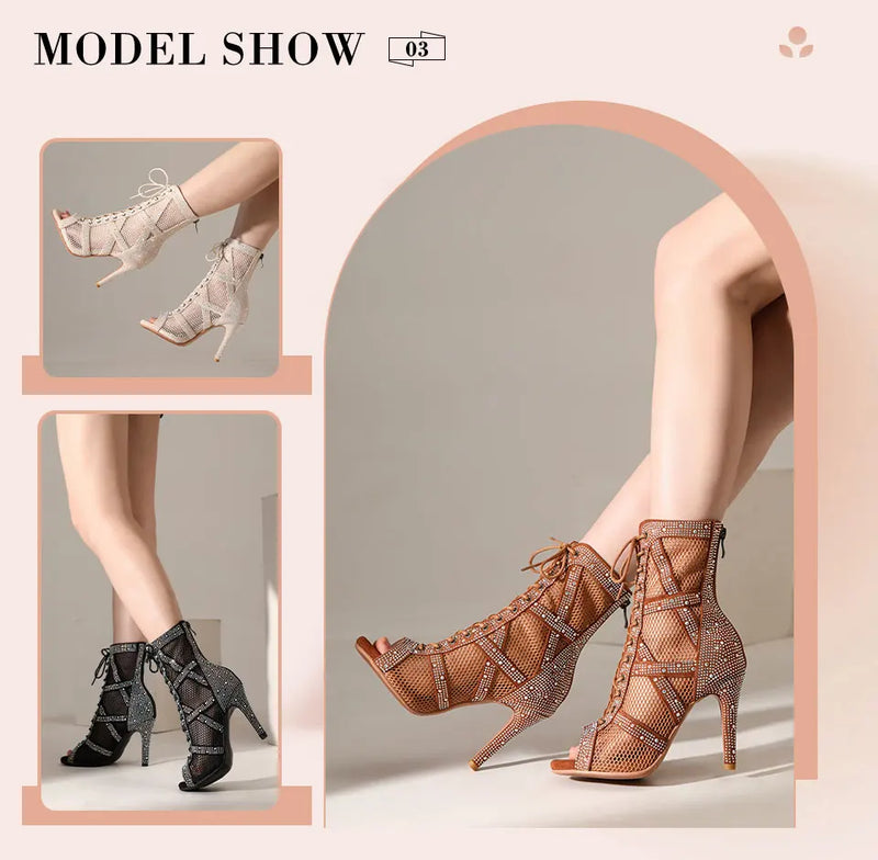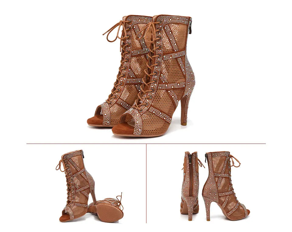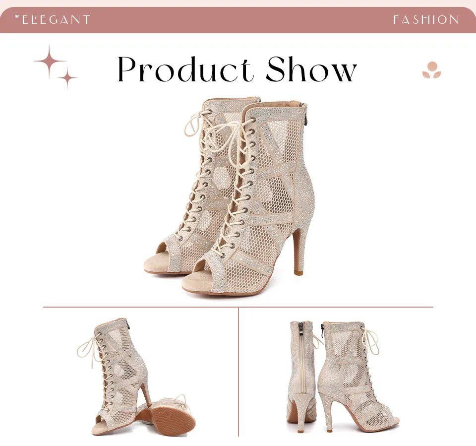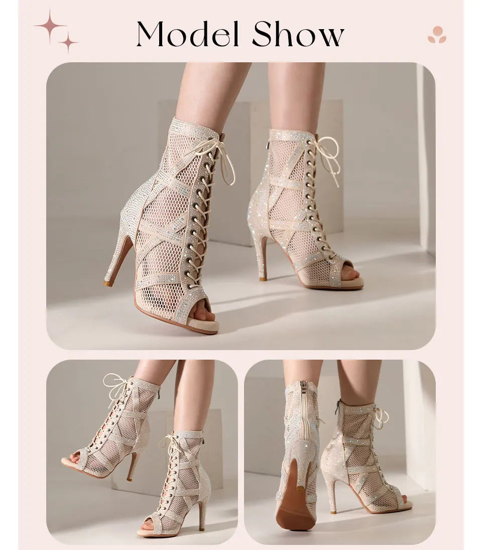 presentation - Chaussures de Danse Latine à Talons Hauts – Modèle LUNA II Strass Styletto Beige - Couleurs Lagon