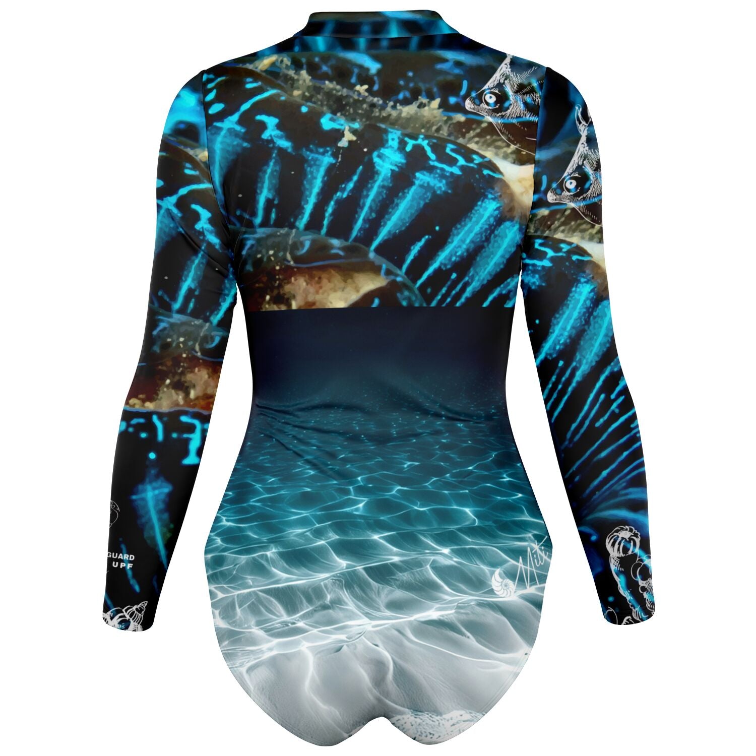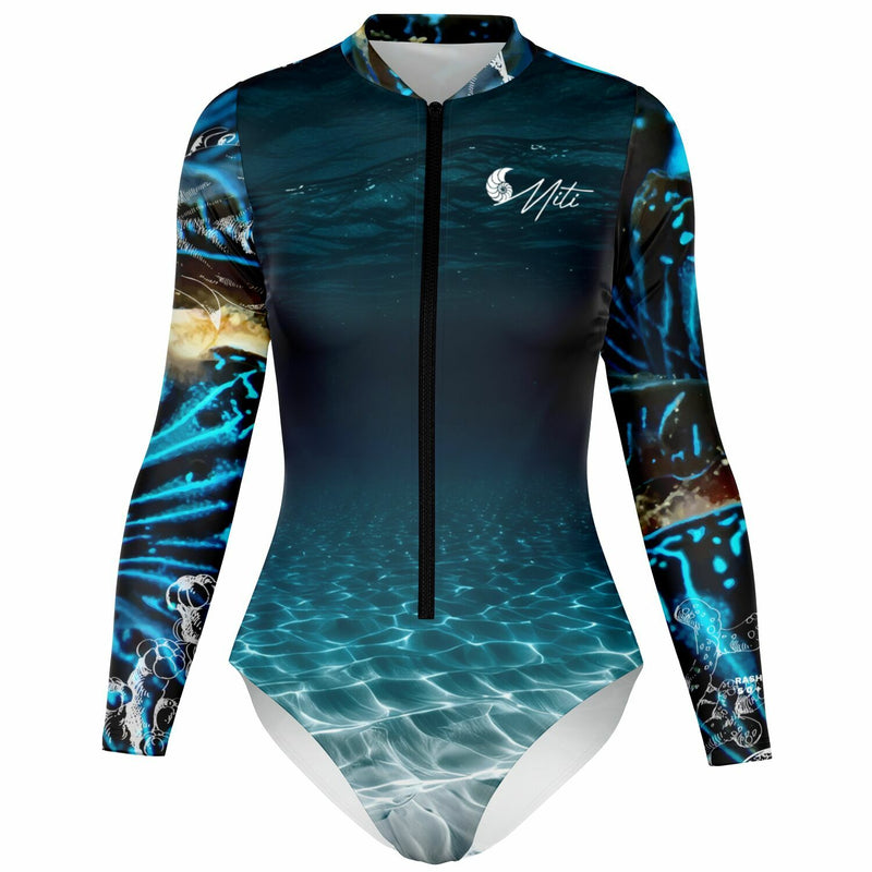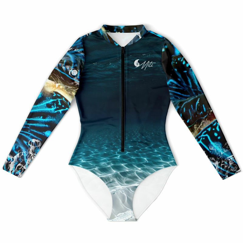 Profitez pleinement de vos sessions surf et baignade avec cette combi surf manches longues MITI au motif bénitier bleu océanic sombre, pensée pour sublimer votre silhouette tout en protégeant votre peau.