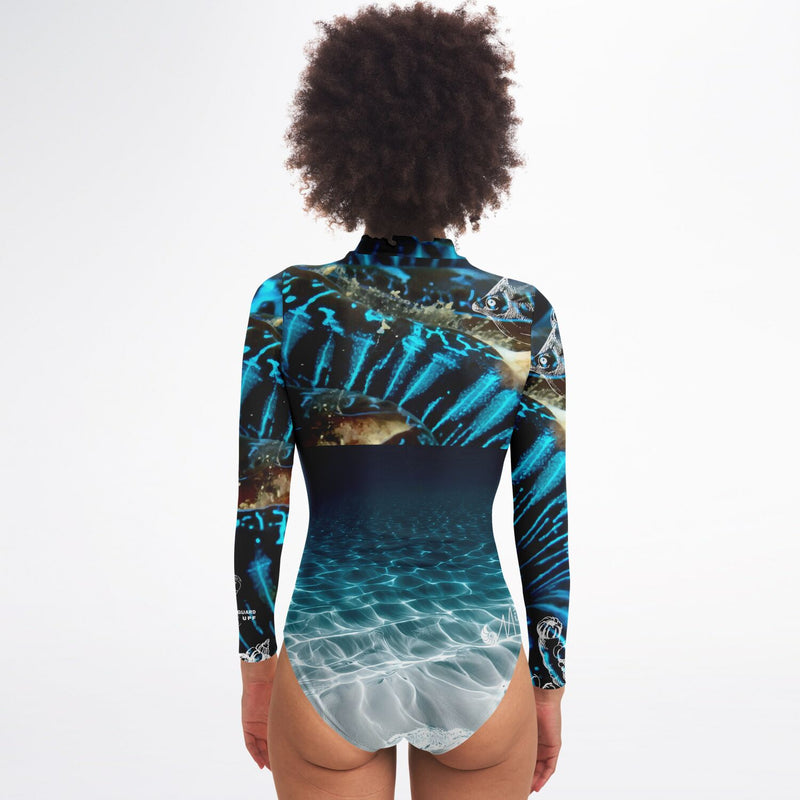 • Manches longues, coupe body une pièce, fermeture éclair plastique sur le devant