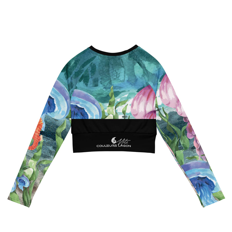 Découvrez ce Crop Top Lycra Femme Manche Longue Recyclé UPF50 Bleu Marine Meduse, l'option idéale pour allier performance sportive et engagement écologique. Confectionné en polyester recyclé et élasthanne, ce haut à manches longues offre une coupe confortable grâce à sa large bande à double couche et son étiquette d'entretien détachable, garantissant un effet quick dry optimal.