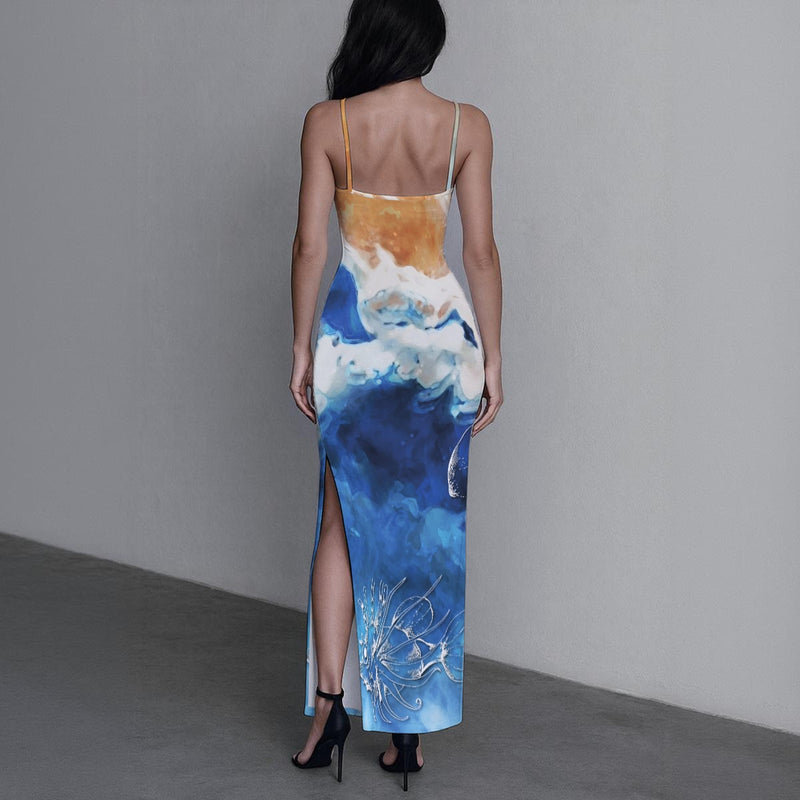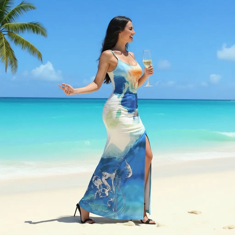 Affichez votre élégance lors du Noumea International Kizomba Festival avec cette robe longue évasée, conçue en milk silk texturé bleu et blanc. Ce modèle chic, doté de deux fentes latérales, allie confort, fluidité et raffinement océanique. Parfaite pour les galas, soirées, ou cocktails, cette robe met en valeur la silhouette grâce à sa coupe slim et son tissu doux, respirant et léger. Fabriquée à la demande (92 % polyester, 8 % spandex), cette pièce unique s’adapte à toutes les morphologies, du XS au 5XL. Conseils : lavage doux à froid, séchage faible à l'ombre. Prix : 69,99 €